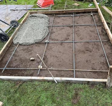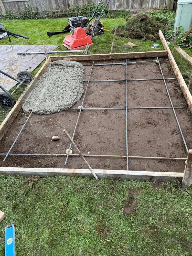 One is a concrete pad for a shed with a broom finish and stamped borders