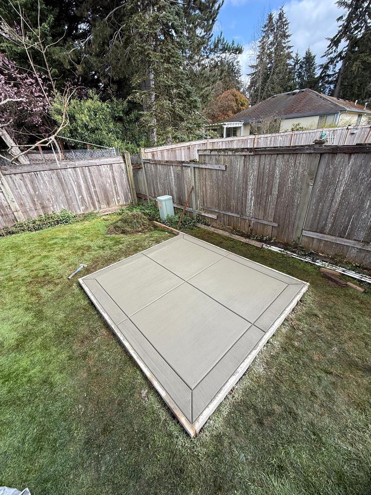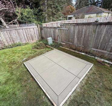 These are 2 small projects. One is a concrete pad for a shed with a broom finish and stamped borders. And the other is a patio extension with an exposed aggregate finish in Renton.